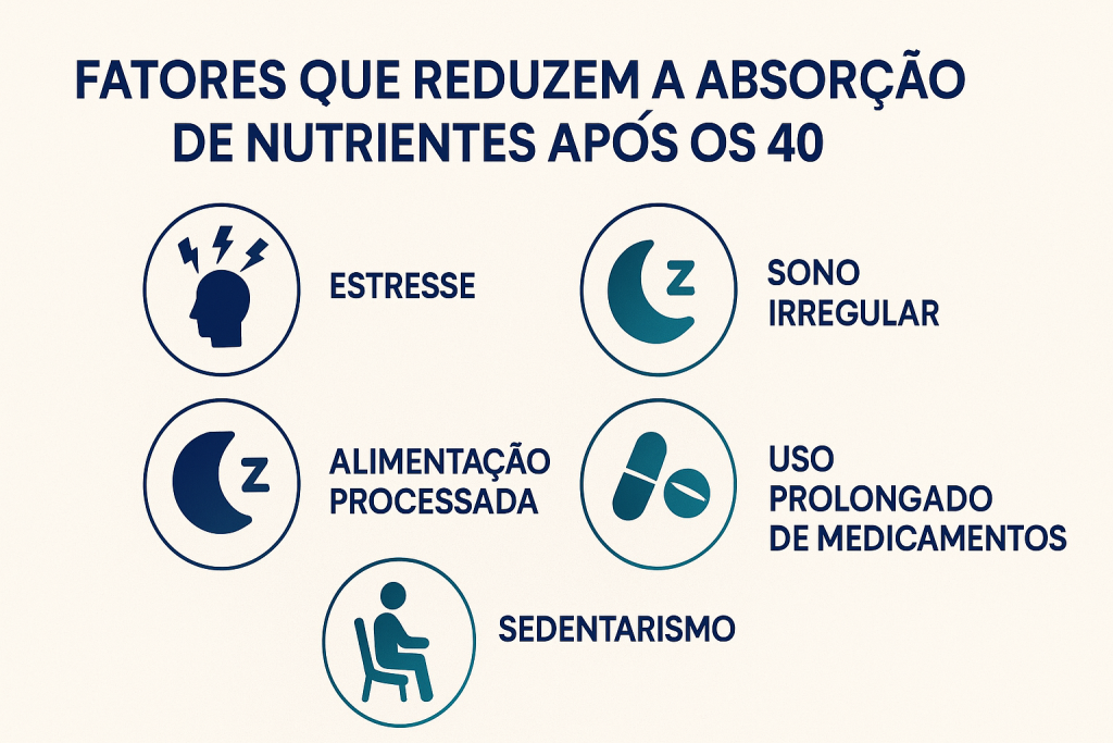 Com o passar do tempo, o organismo naturalmente reduz sua eficiência na absorção de nutrientes, especialmente vitaminas do complexo B, magnésio, zinco e selênio — elementos fundamentais para energia celular, humor, qualidade do sono e imunidade.
