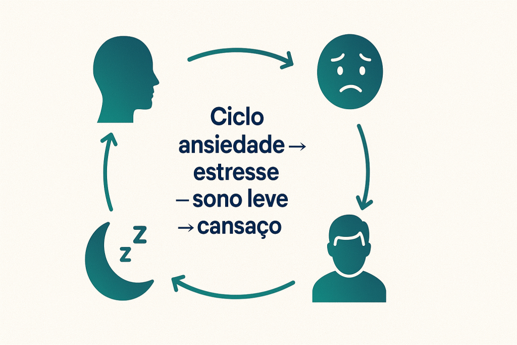 Ansiedade e sono estão profundamente conectados. Quando a mente permanece em estado de alerta constante, o corpo tende a manter ativados mecanismos de estresse, com aumento da produção de substâncias relacionadas à resposta de “luta ou fuga”.