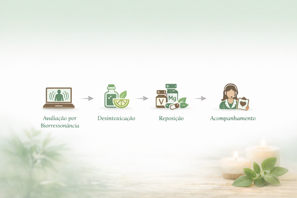 A primeira etapa é a avaliação de bem-estar por biorressonância. Em seguida, quando indicado, entra a desintoxicação natural. A terceira etapa envolve a reposição de vitaminas e minerais, sempre com critério. Por fim, o acompanhamento contínuo permite ajustes de hábitos, rotina saudável e, quando necessário, fisioterapia de apoio.